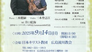 演奏会 デュオ三木・結成60周年記念コンサート in 広島流川教会 日時:2025 9.14(日)開演15:00-(開場14:30)会場:日本キリスト教団 広島流川教会お問い合わせ:三木ミュージックオフィス 084-924-1720 2025.08.28 2025.08.29 演奏会