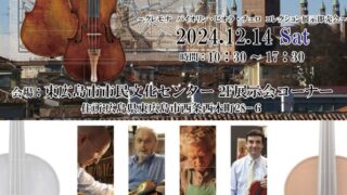 お知らせ ヴァイオリン展示会のお知らせ お世話になっている製作家の三原博志さんが、東広島市内で今年2回目の展示会を行います。そのご案内です。2024年12月14日(土)10:30~17:30東広島市市民文化センター 2F展示室コーナーお問い合わせ先:三原博志バイオリン工房 084... 2024.11.21 お知らせ