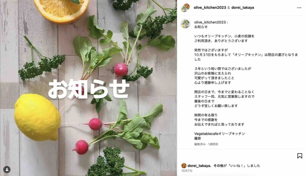 今月いっぱいで閉店します。オリーブキッチン 2025.10.132025.10.15 今月いっぱいで閉店します。 Screenshot と、アナウンスした途端に、連日、早朝から閉店までほぼ満席のオリーブキッチン。 オープン当初から、利用していますが、 こんなに賑わっている光景を見たのは初めてかも,,,,(笑) いつもカウンター席を利用しますが、この日はカウンター席がいっぱい。 来月も再来月も「今月で閉店します!」を前面に出して、お店やればいいのに、、、って思うのは、私だけ???(笑 人間の心理って不思議です。