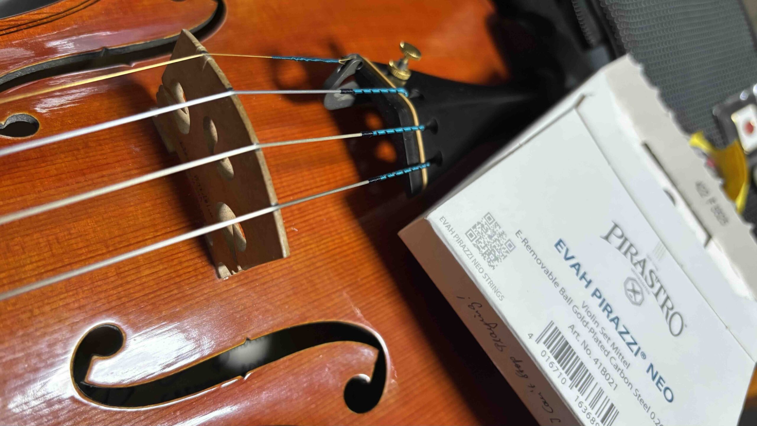 今までは、Evah Pirazzi(オリジナル)が張ってあったのですが、今回試したのは、昨年秋に出たばかりの同じpirastro社のEvah Pirazzi NEO (試供品で頂きもの…)です。