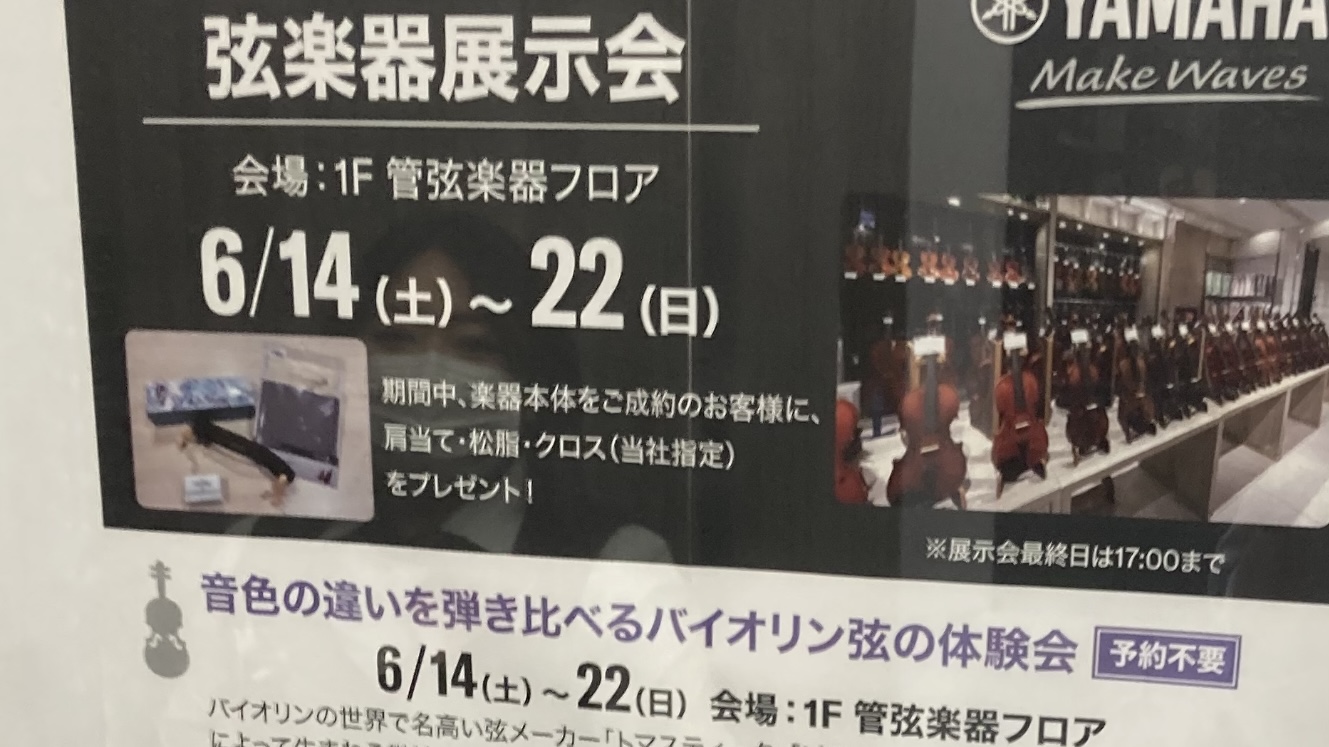「音色の違いを弾き比べるバイオリン弦の体験会(予約不要)やっています。