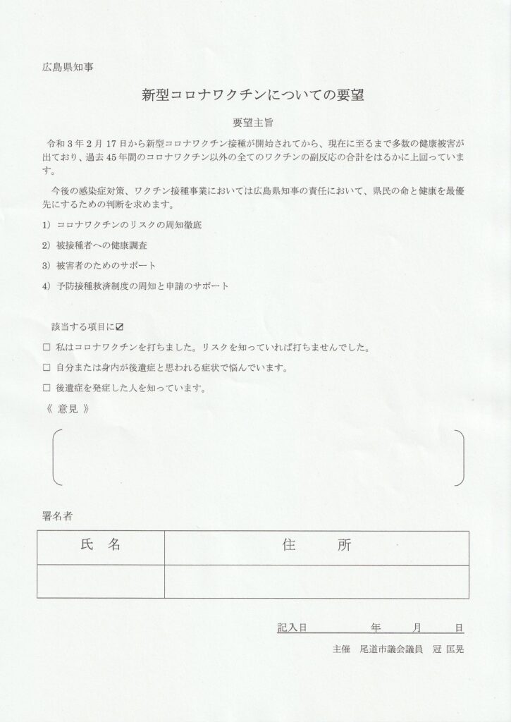 と、いう訳で、広島県知事に対して、尾道市の冠議員さんが行っているコロナワクチン要望について署名活動に協力することにしました。