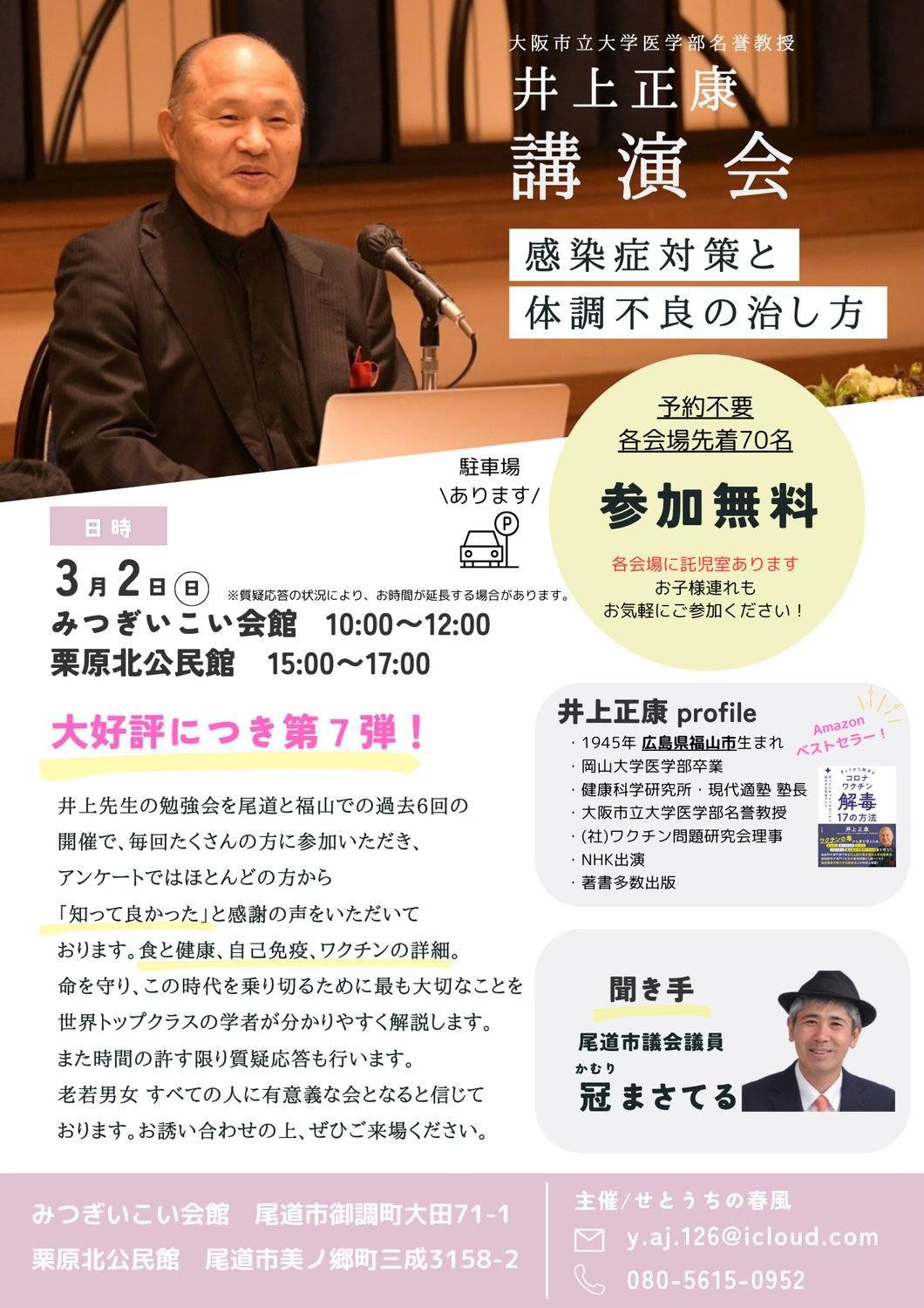 そうういうこともあって、尾道市の冠まさてる市議は、井上正康先生を呼んで講演会を開いているそう。今回で7回目とおっしゃっていたかな?