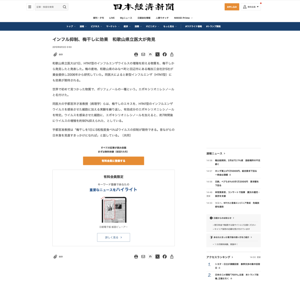 和歌山県立医大は1日、H1N1型のインフルエンザウイルスの増殖を抑える物質を、梅干しから発見したと発表した。梅の産地、和歌山県のみなべ町と田辺市にある梅加工会社計5社が資金提供し2006年から研究していた。同医大によると新型インフルエンザ(H1N1型)にも効果が期待される。